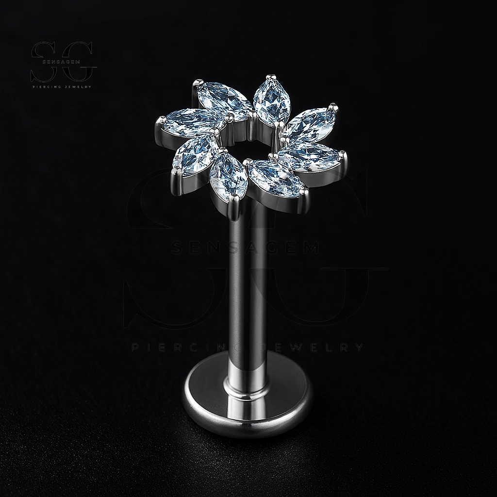 SG4021 Labret con rosca interna de titanio con flor de circonita cúbica azul marquesa
